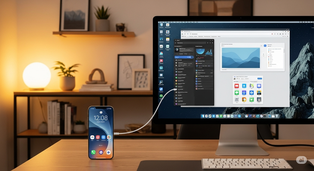 USB-C to HDMI 케이블 연결과 무선 연결 모두 가능해, 상황에 맞게 자유롭게 데스크톱 모드로 전환할 수 있습니다. - 활용 예시