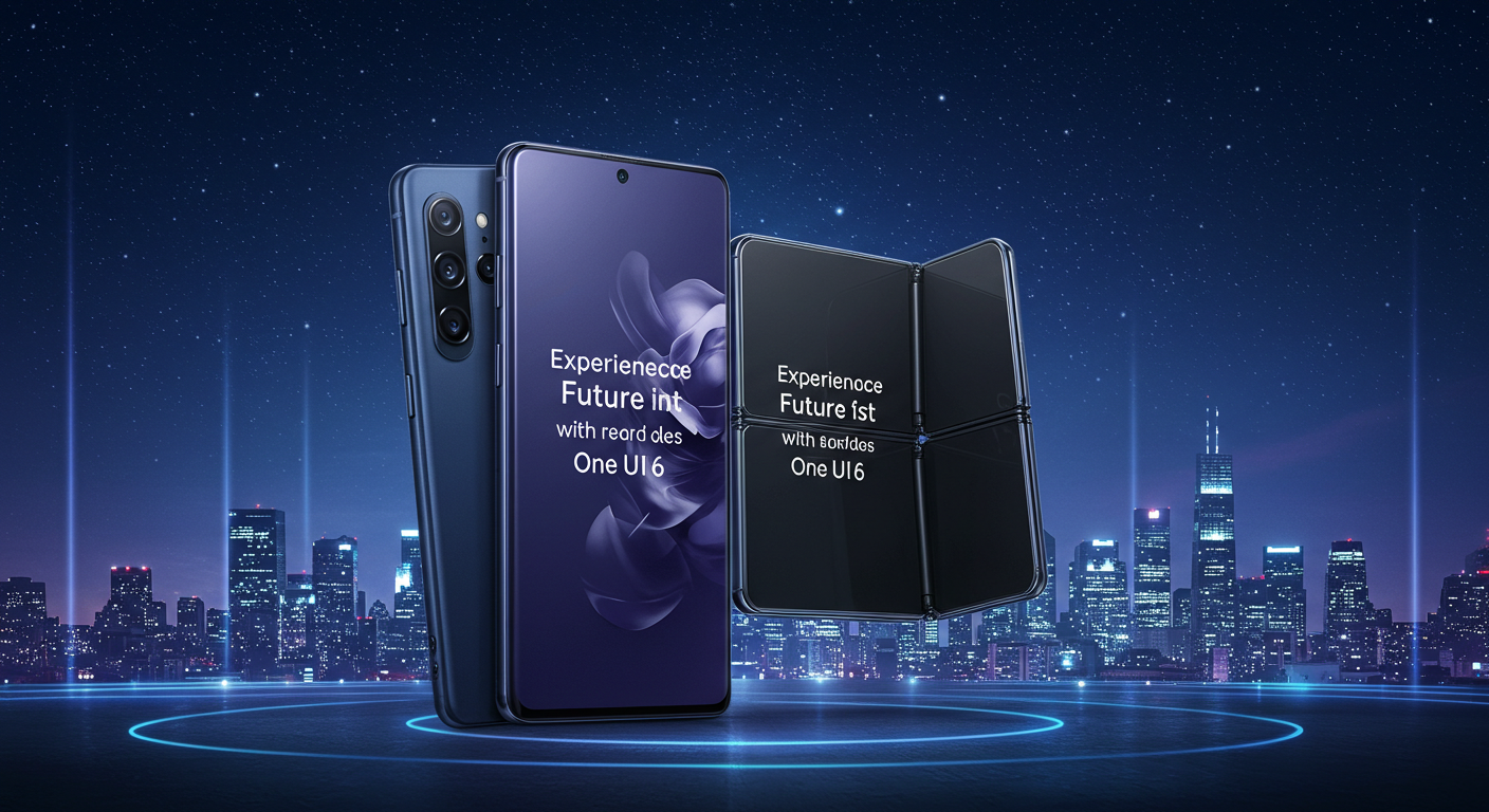“밤하늘 도시 전경 속에서 Galaxy S24와 Z Flip6, Z Fold6가 반짝이며 서 있고, 화면에는 ‘Experience the Future with One UI 8’ 라는 문구, 미래적인 광고 촬영 느낌, 16:9 비율, 고급스러운 조명과 깊은 색감”