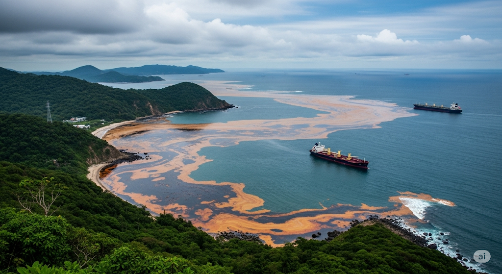 Alt 텍스트: 인도 케랄라 앞바다에서 유출된 기름으로 어두워진 바다, 붉게 물든 하늘이 절망을 말하고 있음