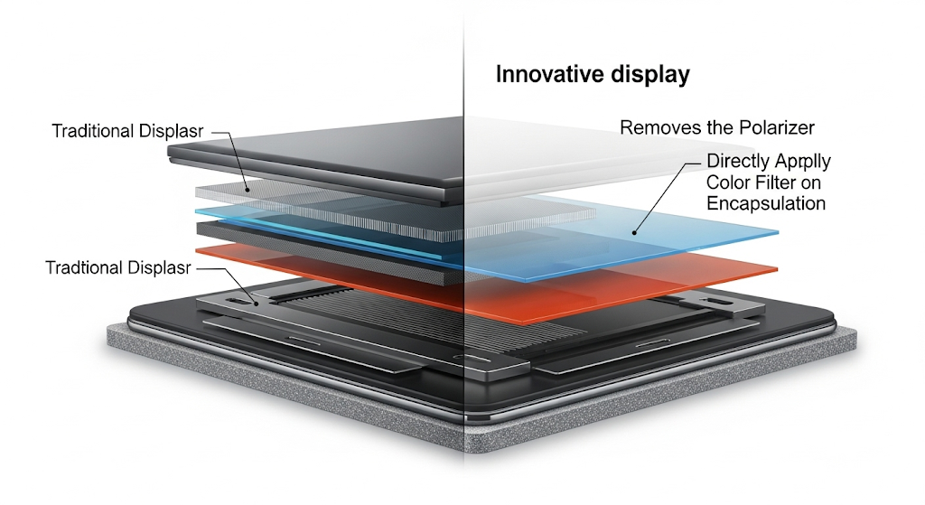 - 향상된 밝기와 전력 효율: 빛의 손실이 줄어들어 훨씬 더 밝고 선명한 화면을 구현할 수 있습니다. 동시에 같은 밝기를 내는 데 필요한 전력은 줄어들어 배터리 사용 시간도 늘어나는 효과를 기대할 수 있습니다.