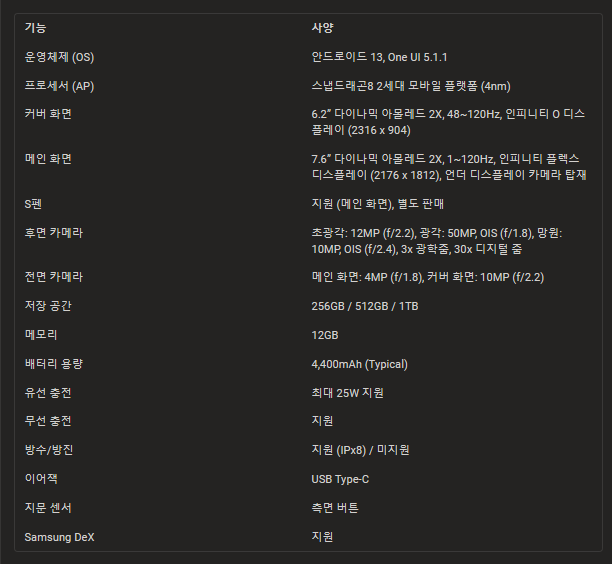z폴드 5 언더 디스플레이 카메라와 S펜을 탑재한 7.6인치 폴더블 스마트폰