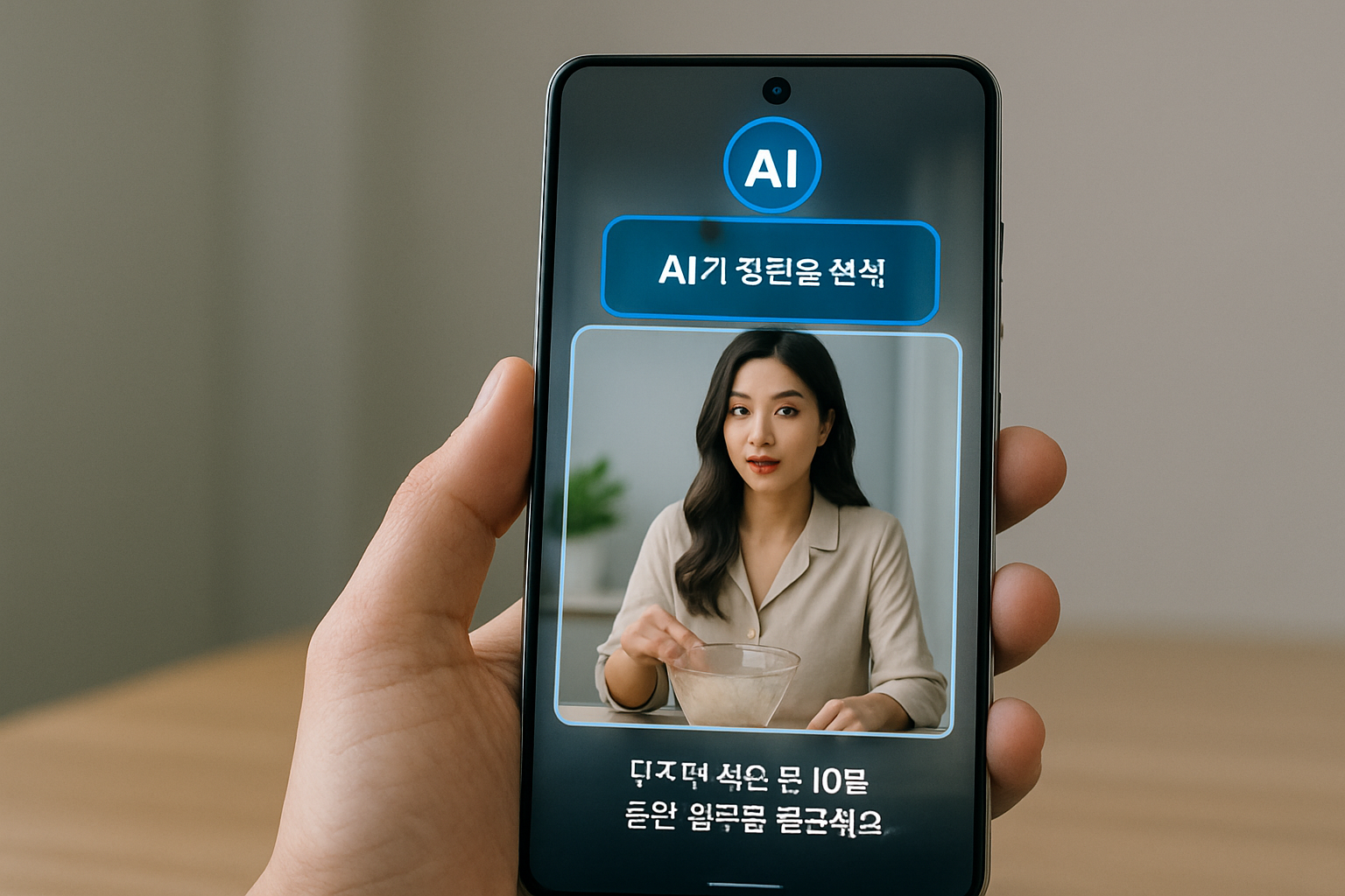 “스마트폰 화면에 AI가 비디오를 요약 중인 모습, 자막과 주요 장면이 자동으로 하이라이트 처리되는 UI 인터페이스”